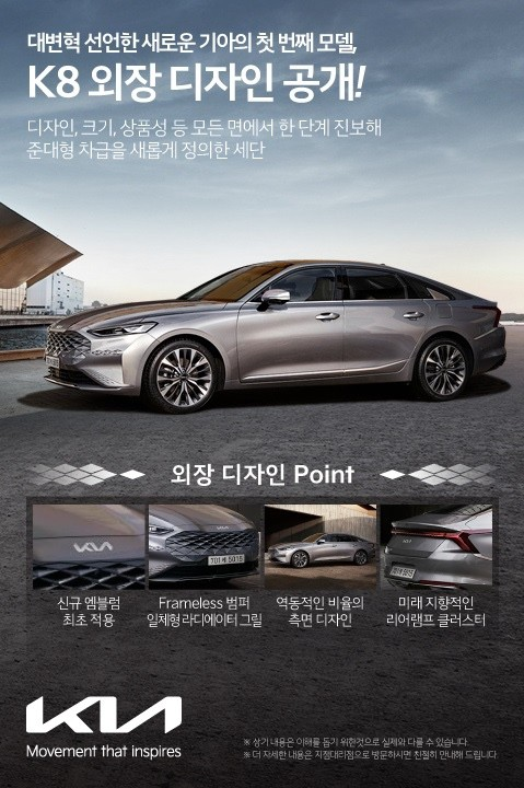 이번 K8은 유례를 찾아보기 힘든 정보로 급(?)하게 공개가 되었는데, 공식 티저의 과정없이 실체 차량이 공개 되었습니다.