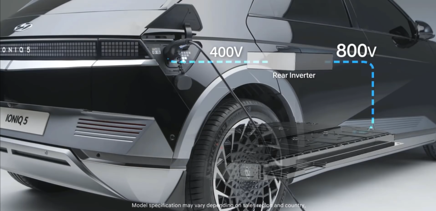 400V 기존 급속 충전기를 이용해서 800V로 충전하는 기술을 제공하는데, 이러한 기술은 리어 인버터가 800V로 승압하는 기능을 제공합니다.