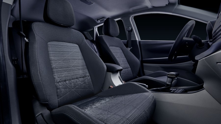 직물 시트의 디자인과 패턴은 젊고 경쾌한 느낌입니다. 1열 레그룸은 1072mm로 1000mm가 넘어가면 충분히 여유로운 공간을 느낄 수 있습니다.