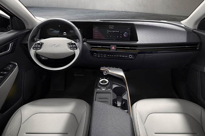 계기판과 내비가 연결된 파노라믹 커브드 디스플레이와 새로운 디자인의 스티어링, 운전석에서 조수석으로 연결되는 개방감을 강조한 한 줄의 송풍구 디자인, 새로운 인터페이스와 디자인을 선보인 공조기, 원형 다이얼 변속기까지 K8에서 선보인 디자인 요소가 EV6에도 거의 동일하게 제공되네요!