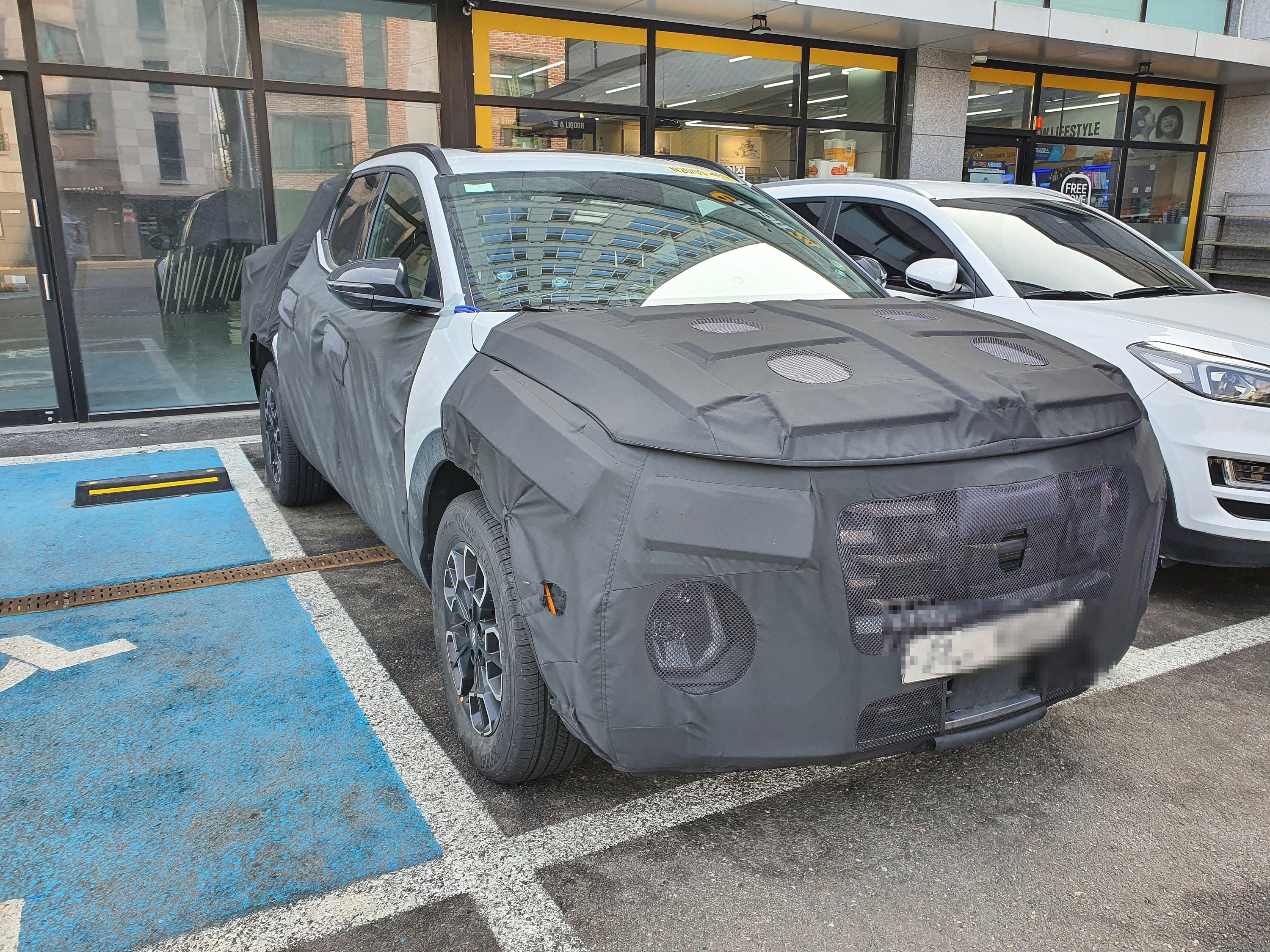 국내 주차장에서 포착된 테스트 차량의 경우 주차 구획 안쪽으로 들어와 있는 차체를 볼 수 있는데, 크기를 가늠할 수 있습니다.