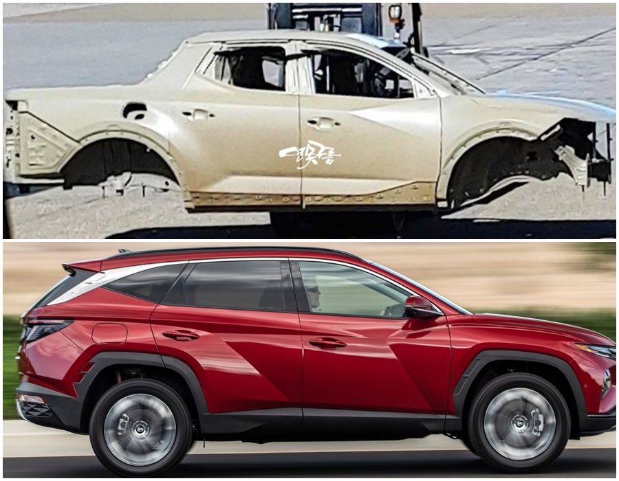도로에서 포착된 사진을 제보해 주셨는데, 뒤에 화물 적재 공간을 제외하고 본다면 투싼의 측면부 실루엣과 비슷한 것을 확인할 수 있습니다.