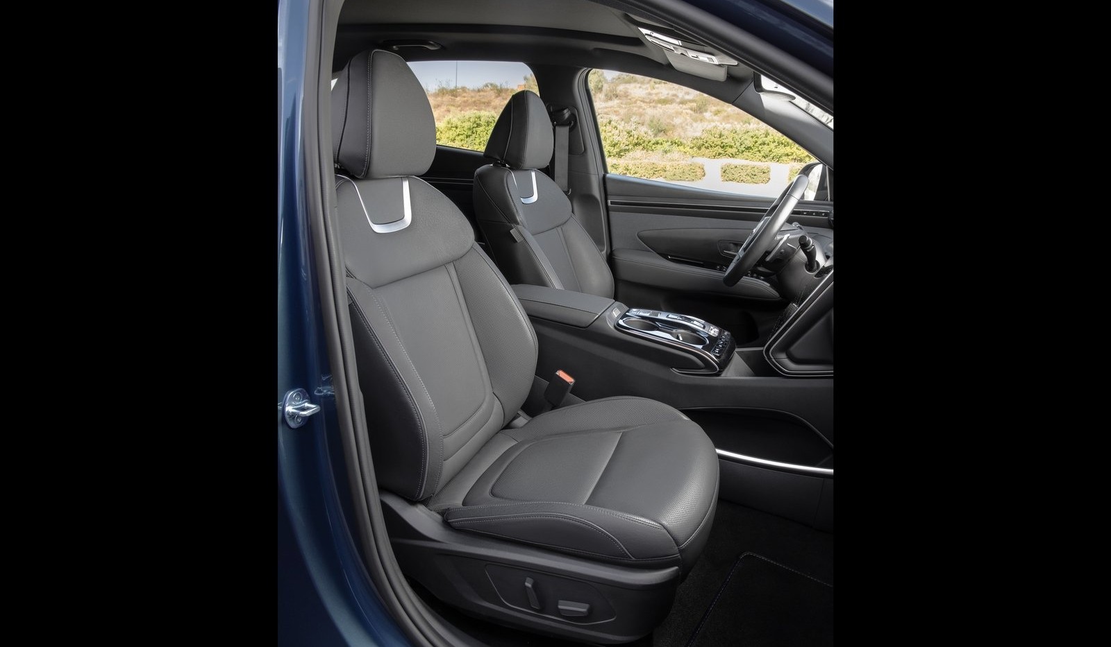 헤드레스트 하단에 메탈 포인트 디자인과, 시트 디자인, 도어트림 쪽 한 줄의 하이그로시 마감 소재, 도어트림 디자인을 잘 보세요!