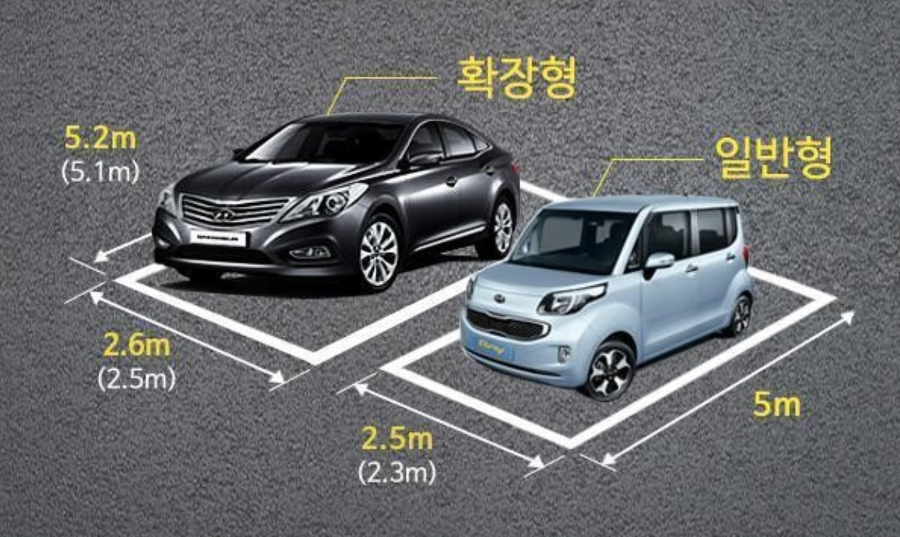 국내 주차 구획 사이즈는 2.3m*5m 입니다.