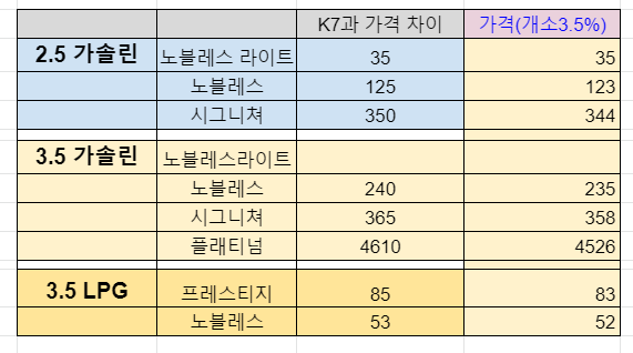 가격은 가솔린 엔진은 이전 K7 대비 100~350 만 원 정도 인상 되었습니다. 반면 LPG의 경우 50~80만원 정도 인상되었습니다.