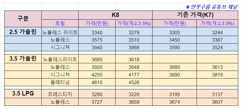 기아 K8 사전 계약 공개! 가격과 트림, 옵션 분석! 하이브리드 미공개! KIA K8 GL3 Offical TRIM&Price