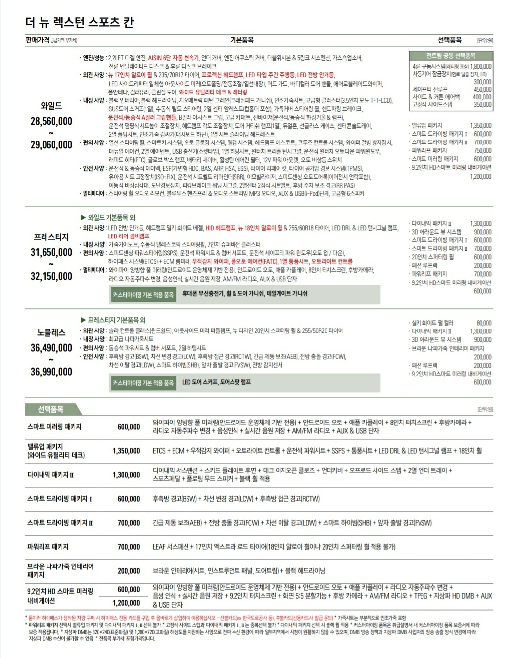 가격을 보면 새롭게 신설된 와일드 트림은 2856~2906만 원이며, 프레스티지 3165~3215만 원으로 기존 보다 외장과 내장 그리고 편의사양이 기본으로 제공되면서 279~329만 원이 인상되었습니다.