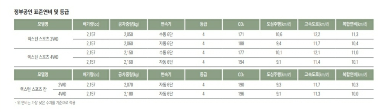 따라서 렉스턴 스포츠 2륜은 수동 변속기 복합 연비 11.3 자동 10.4 / 4륜 수동 11 자동 10.1km/L 입니다.