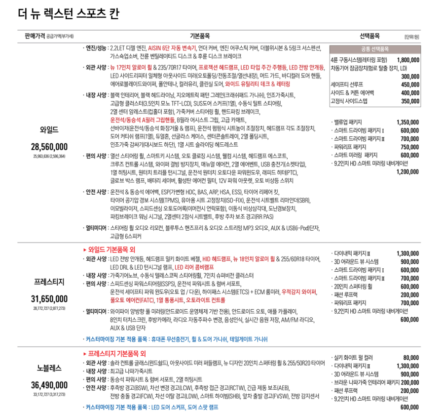 프레스티지의 경우 스포츠 칸에서 가성비 트림으로 LED 리어 콤비램프, HID 헤드램프, 풀오토 에어컨, 무선 충전기, 익스테리어 패키지가 포함되어 있습니다.