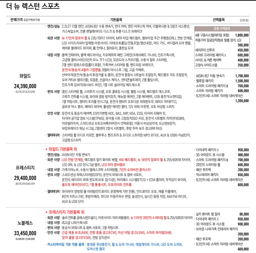 기존 렉스턴의 경우 와이드 / 프레스티지 / 스페셜 / 다이내믹 에디션 / 노블레스