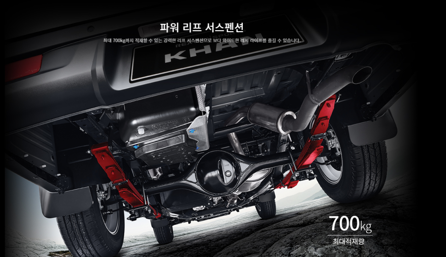 리프 서스펜션은 큰 하중의 지지하기 때문에 레저 등의 목적으로 무거운 짐을 수납해야 한다면 700kg까지 적재 가능한 리프 서스펜션을 선택하시면 됩니다.