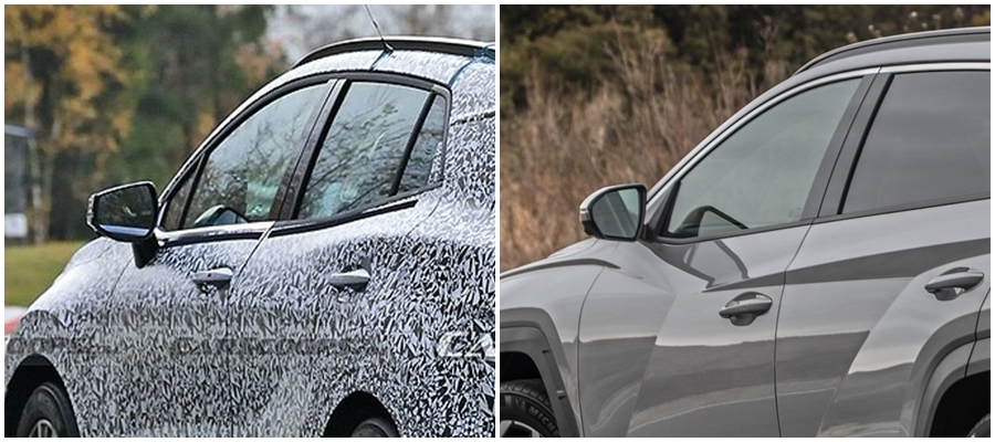 왼쪽이 새로운 스포티지 차량이며, 오른쪽이 투싼인데, 사이드 미러의 위치를 잘 보세요!