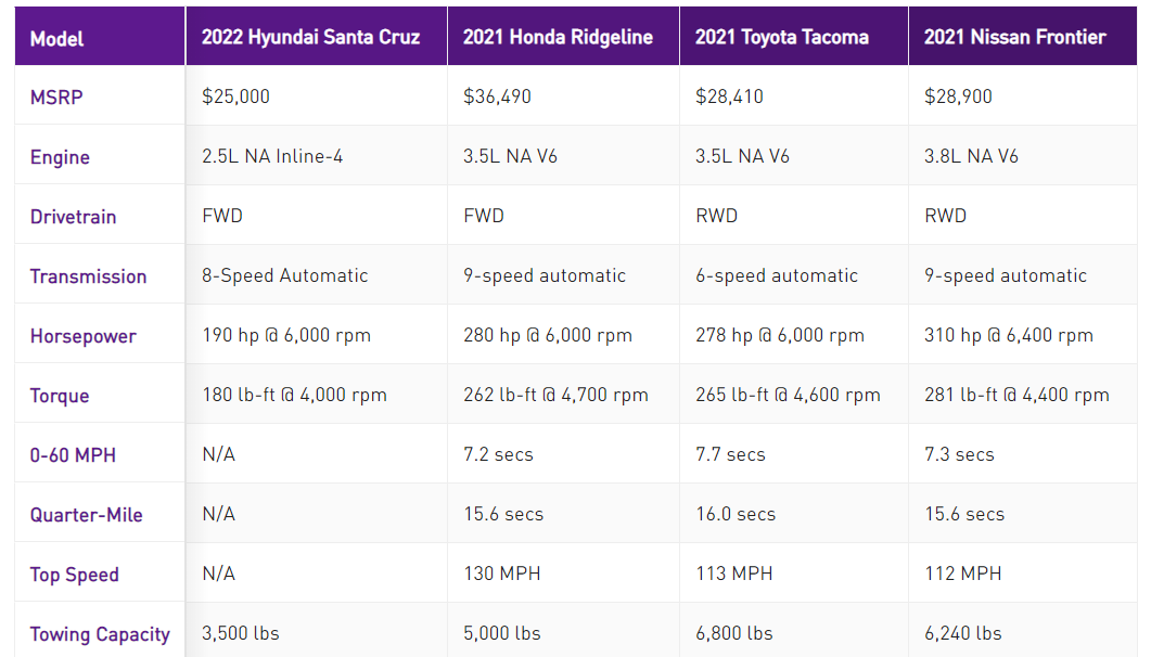 미국 시장에서 경쟁관계의 픽업 트럭과 비교해 보면 다운 사이징 엔진에 2.5 터보 엔진 기준으로 비슷한 출력을 제공하고 견인력의 5000lbs로 조금 낮지만 대형 카라반이 아니라면 중형급 카라반까지 견인할 수 있습니다.