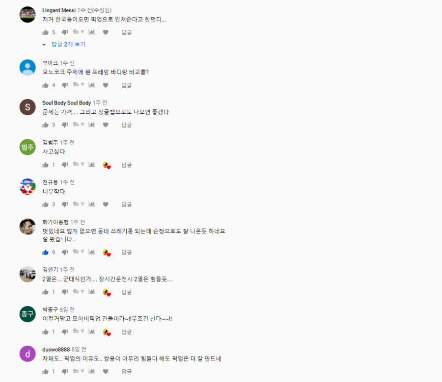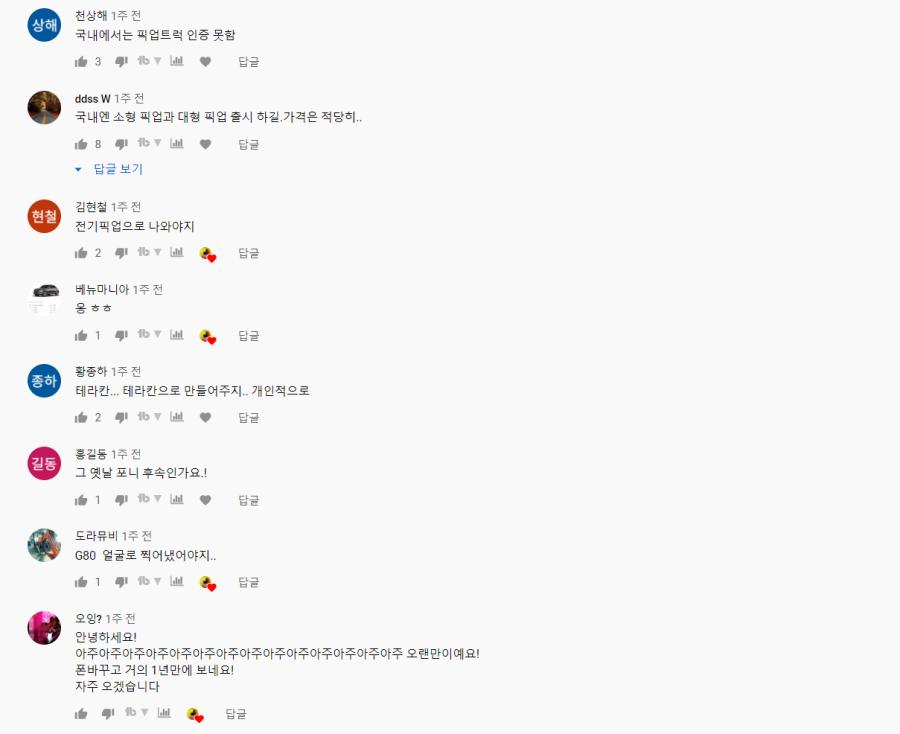 미국 등의 반응은 새로운 픽업 트럭에 대해서 흥미롭고 반갑다는 반응과 다르게 국내의 경우 정확한 스펙 등이 알려지지 않은 상태에서 디자인만 보고 판단해야 하는 상황이라서 의구심을 제기하는 반응이 높았습니다.