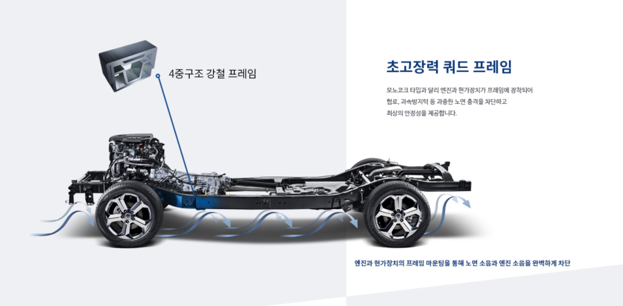 튼튼한 강성을 대표하는 바디온 프레임으로 제작된 렉스턴의 경우 모하비와 함께 국내에서 유일한 바디온 프레임 차량입니다.