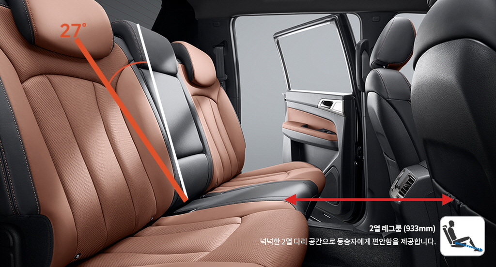 렉스턴 스포츠의 경우 제조사의 홍보 자료를 보면 2열 레그룸이 933mm 입니다.