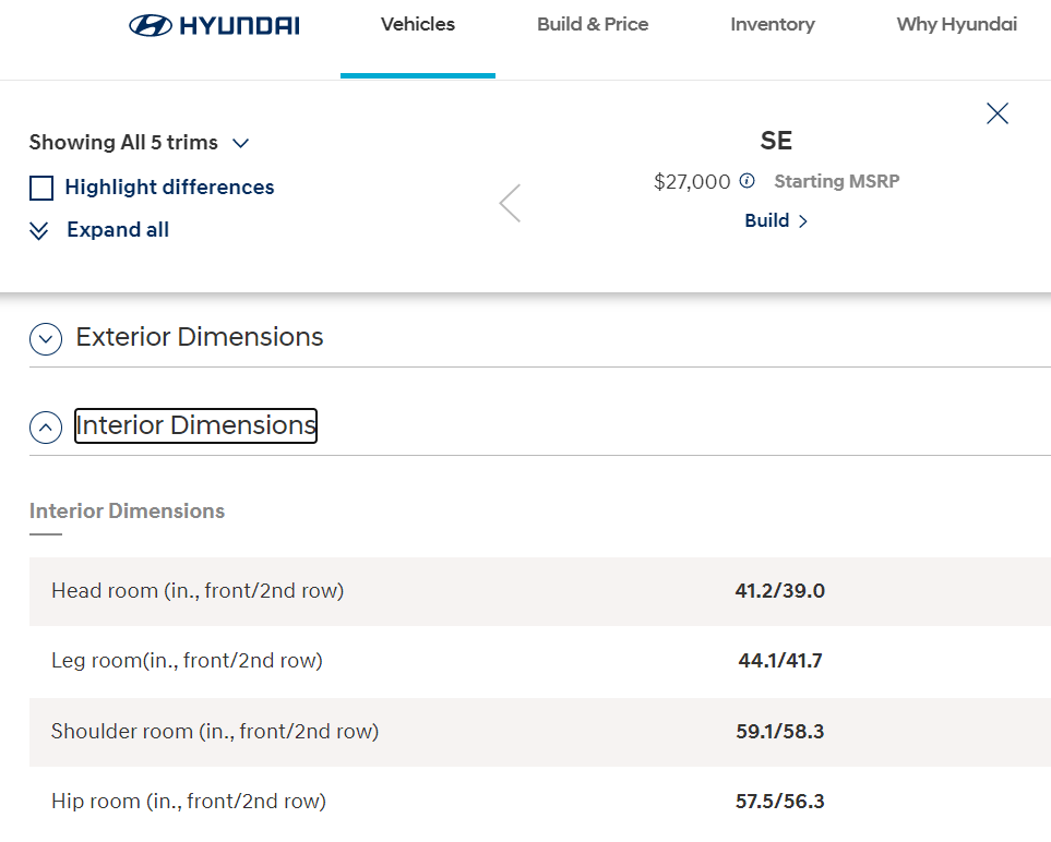 먼저 싼타크루즈의 레그룸 공간을 보면 1열이 44.1 인치, 2열이 41.7 인치입니다.