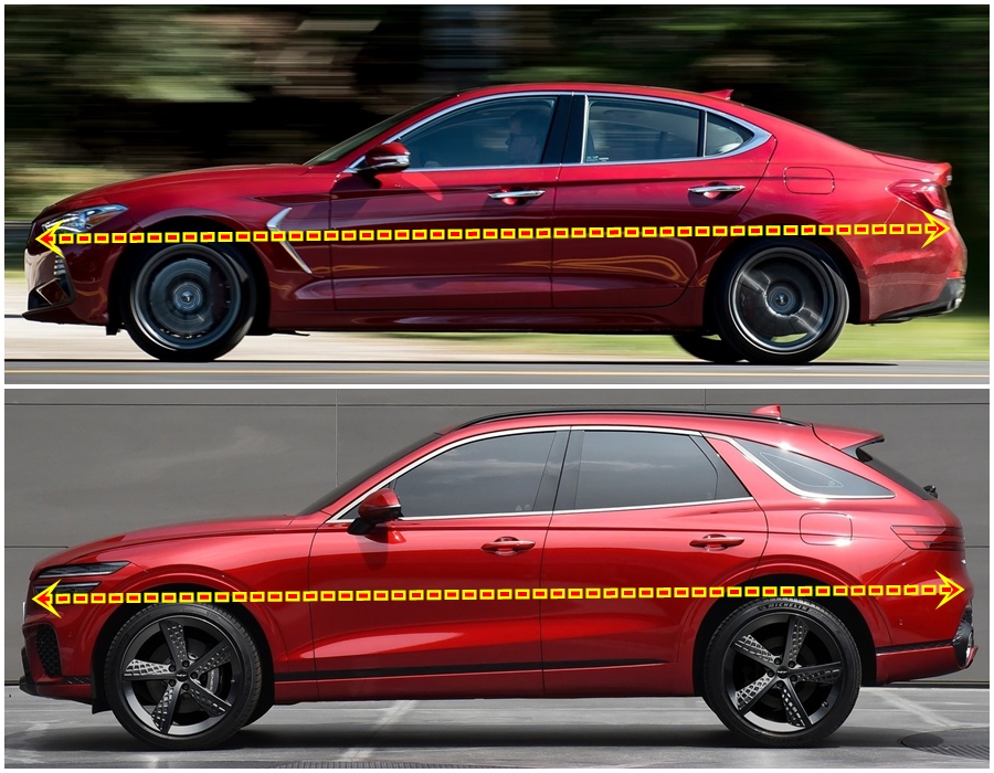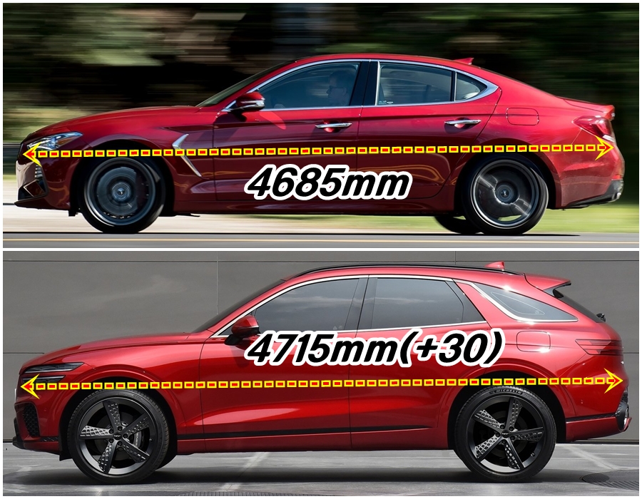 세단인 G70의 전장은 4685mm SUV 4715mm로 두 차량은 전장에서 30mm 3cm 정도의 차이만 있습니다.