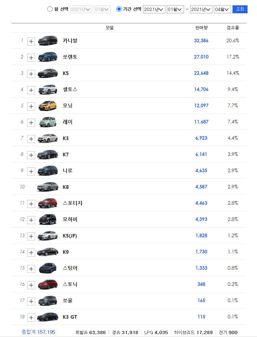 이런 핵심 차량의 부진과 함께 기아는 자동차 시장의 대세라고 할 수 있는 SUV/RV에서 셀토스,쏘렌토와 카니발을 앞세워서 소형, 중형, 대형 시장을 모두 석권하고 있는 상황입니다.