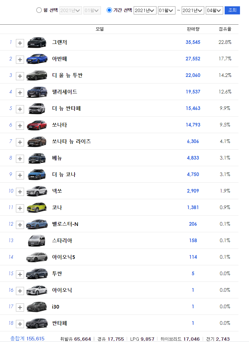 판매량은 곧 성적표라고 할 수 있는데, 현대차와 기아는 올해 1월부터 4월까지 판매량을 보면, 현대차가 15만 5615대를 판매한 것으로 나타났으며, 기아는 15만 7195대를 판매한 것으로 나타났습니다.
