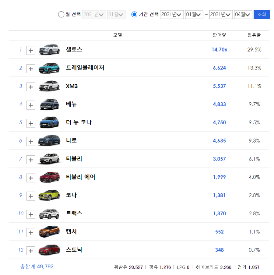4위에 베뉴와 5위에 코나가 있지만, 모두 합쳐도 기아 셀토스의 판매량에 한참 못 미치는 결과를 보여주고 있습니다.