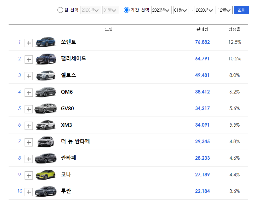 대형 SUV 팰리세이드는 동 기간에 64791대를 판매했는데, 대형 SUV 시장이 중형 SUV 시장 보다 훨씬 작은 점을 고려해 본다면....