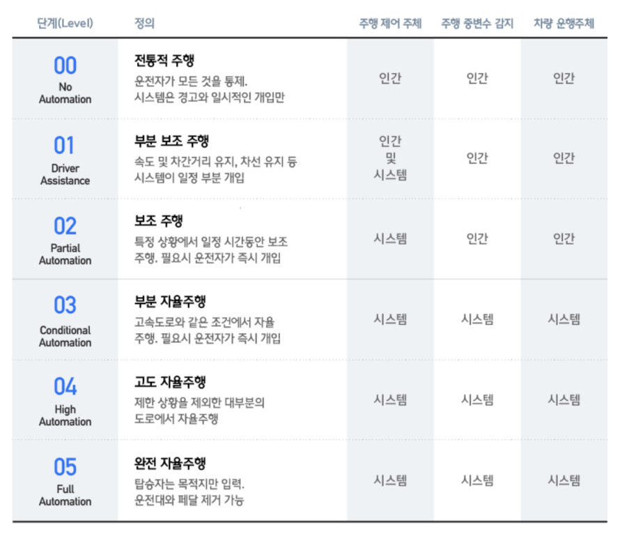 자율 주행 기술은 총 0부터 5레벨까지 6개의 단계로 구분되어 있으며, 구분 방법은 기술수준 / 제어주체/ 주행 책임 3가지만 기억하시면 되요!