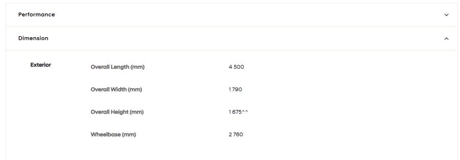 차량 길이에 해당되는 전장은 4500mm 전폭 1790mm 전고 1675mm 축거는 2760mm 입니다.