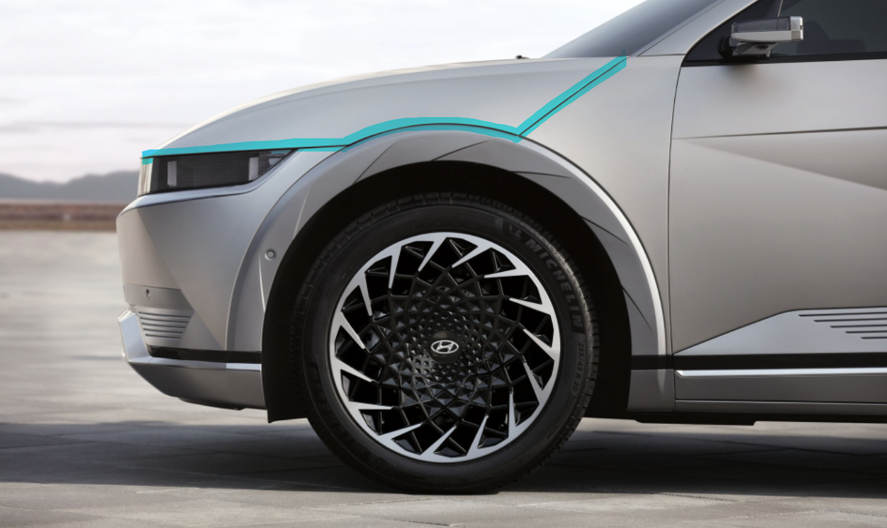 아이오닉5는 이렇게 완전히 덮는 방식의 디자인이 특징으로 공기 저항을 줄이고 연비를 높이는 디자인 요소죠!