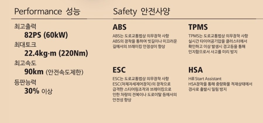 ESC, ABS, TPMS 장착 됩니다. 기존 다마스가 단종된 이유인데, 기본 안전 사양을 갖추게 되었습니다.