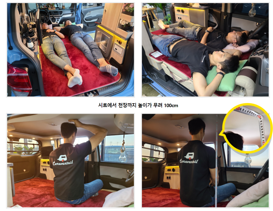 국내 캠핑카 전문업체인 카라반테일에서 만든 로디 차량의 실내인데, 180cm가 넘는 두 남성분이 충분히 차박을 할 수 있는 공간을 제공하는 것을 알 수 있습니다.