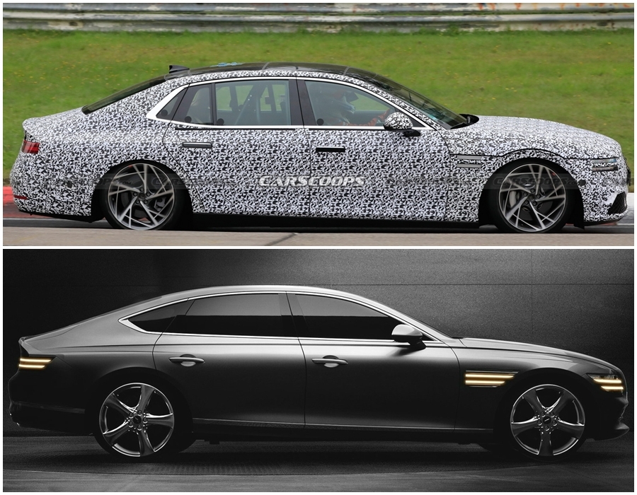 직접 비교해 보면, 공식 사진도 아닌 테스트 차량인데, 기존 G90이 통통해 보일 정도로 압도적인 측면부 디자인을 보여주네요!