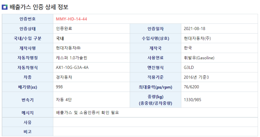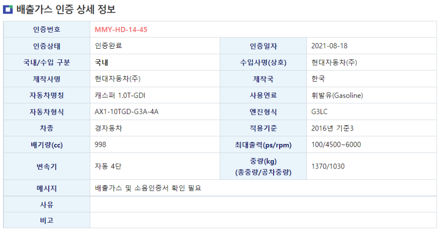 이번 주 18일에 캐스퍼의 배출가스 인증이 완료되었습니다.