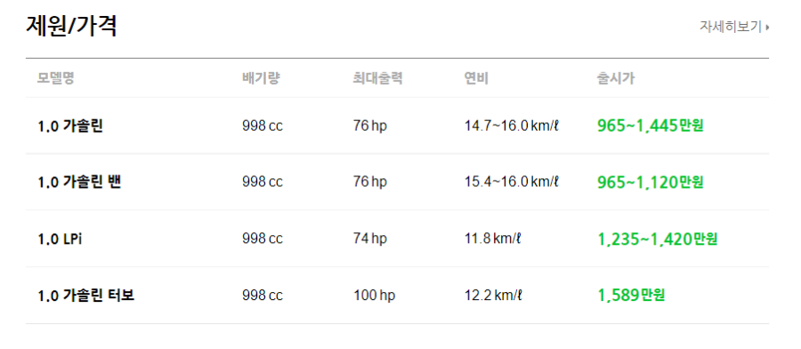 인증 내용을 보면 1.0 엔진에 GDI 터보 엔진과 가솔린 모델을 확인할 수 있네요.