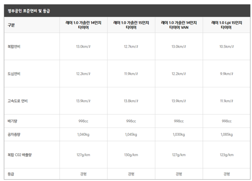 동일한 엔진을 장착한 레이의 경우 리터당 13km/L입니다.
