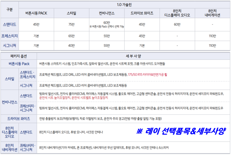 편의 사양에 해당되는 컨비니언스는 열선시트, 풀오토에어컨,세이프티 파워윈도우 등의 편의 기능을 제공하며 레이에서 60만원, 모닝에서 50만원에 시작됩니다.