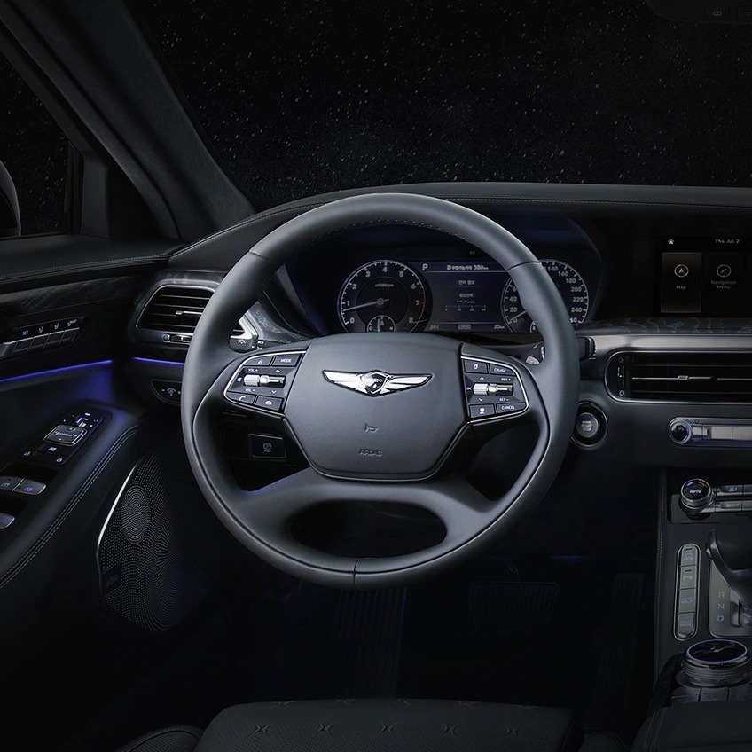 G90의 스티어링 휠 디자인은 지금까지 출시된 제네시스 차량들 중에서 GV60과 가장 유사한 디자인입니다.