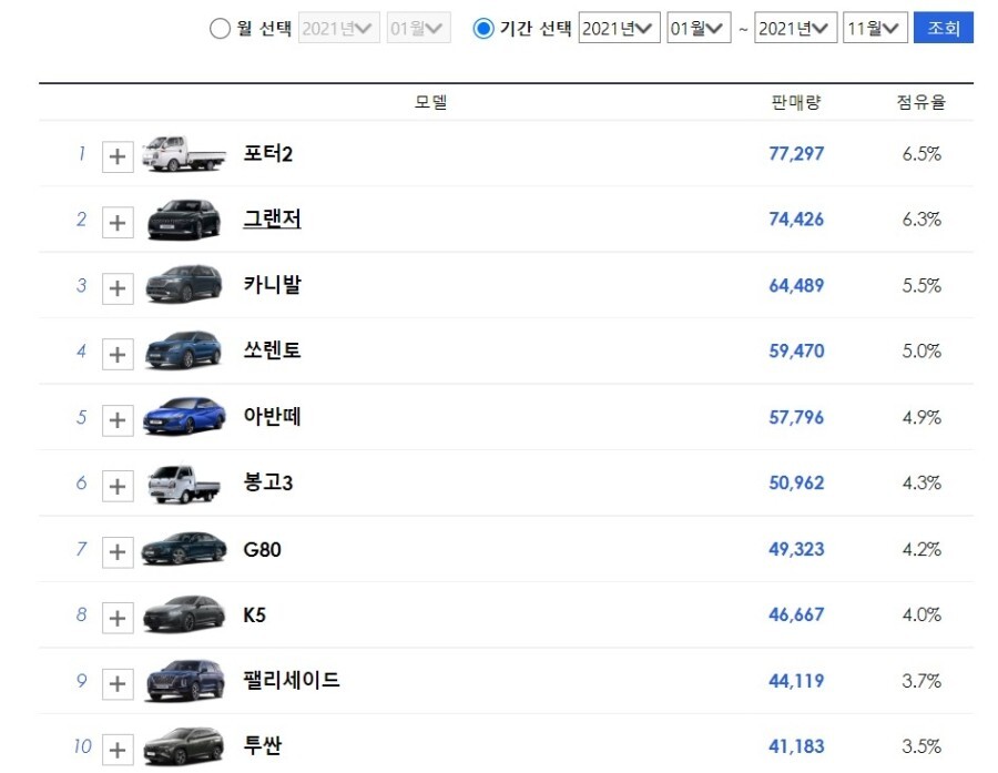 그랜저가 1위라는 것은 아실 거고, K5, 쏘나타, 싼타페, 쏘렌토보다도 많이 판매가 되었어요!