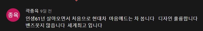 61년을 살아오면서 현대차 중에서 마음에 드는 디자인이 처음이다.