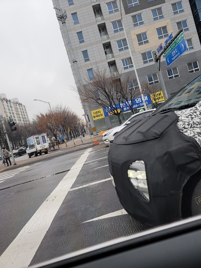 출시가 코 앞에 다가온 점을 알 수 있는 테스트 차량인데, 검정색 두터운 위장막 커버가 완전히 제거되고 얇은 위장막 테이프로만 가려져 있는 상태죠!