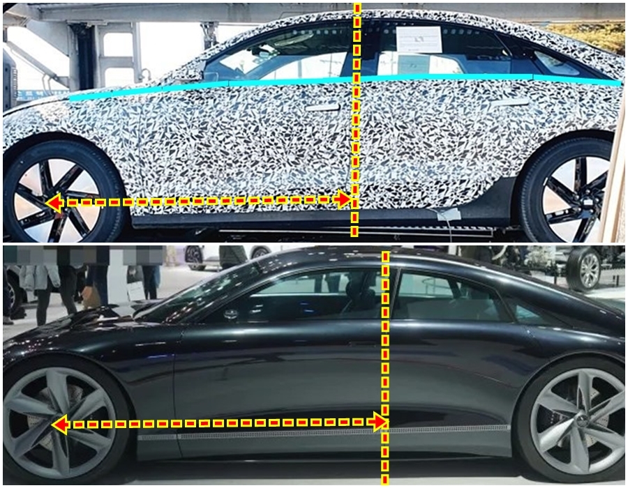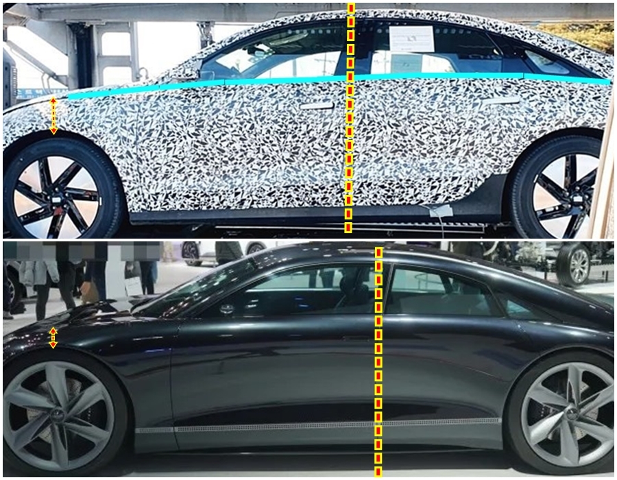 동시에 콘셉트와 비교해 보면 테스트 차량이 아래에서 촬영되다 보니 약간의 차이가 있지만