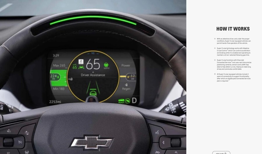 슈퍼크루즈가 작동시 스티어링 상단에 녹색으로 표시등이 켜지고 계기판 화면도 작동되고 있음을 직관적으로 보여주는데..