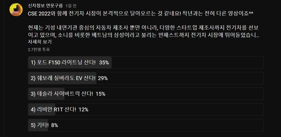 공개된 실버라도 전기차의 경쟁력을 보고 대단하다는 말을 할 수밖에 없어서 채널에 "구독자분들을 어떤 전기차 픽업트럭을 구입하실 건가요? 설문을 진행했는데..