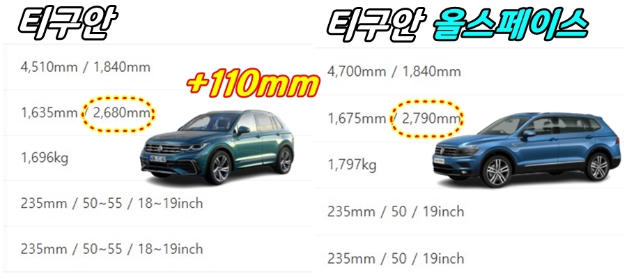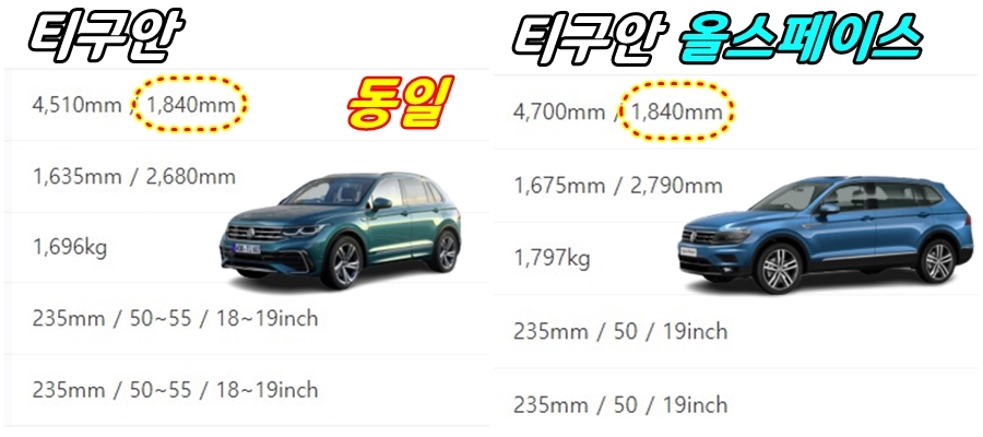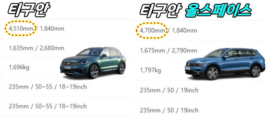 차량의 크기에 해당되는 전장은 티구안 4510mm 올스페이스 4700mm(디젤 기준)이지만