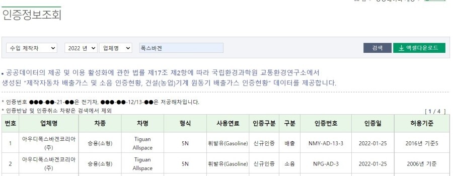 폭스바겐은 올해 첫 번째 차량으로 티구안 올스페이스 가솔린 차량에 대한 소음 및 배출가스 인증을 완료했습니다.