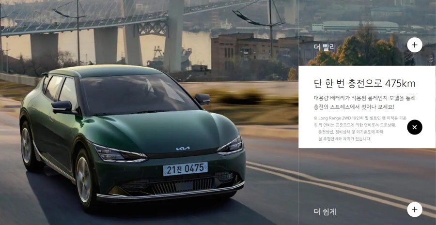 경쟁 차량인 기아 EV6 롱 레인지 2WD의 주행거리는 475km로 77.4kWh 배터리를 장착하고 있습니다.