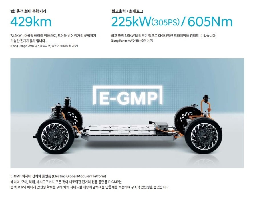 현대자동차 홈페이지에 내용을 보면 72.6kWh 배터리를 완충시 최대 주행거리가 429km를 갈 수 있다는 것을 알 수 있는데