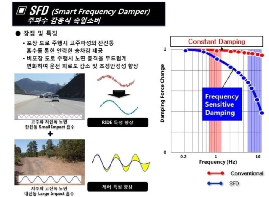 고속도로와 같은 고주파가 발생되는 환경에서는 잔진동을 흡수해 주고 반대로 오프로드와 같은 환경에서 발생되는 저주파를 흡수해서 운전의 피로도를 줄여주는 기술입니다.