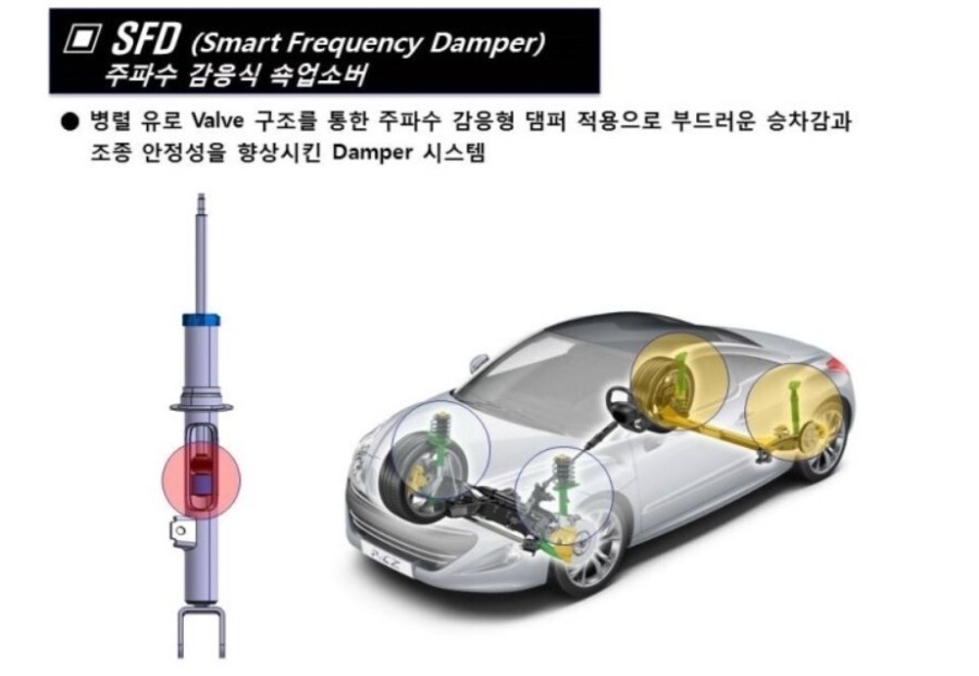 만도에서 제작한 기술 자료를 보면 서스펜션에 달린 쇽업쇼버를 통해서 좀 더 부드러운 승차감과 조종 안전성을 향상시킨 댐퍼 시스템이라는 것을 알 수 있어요.