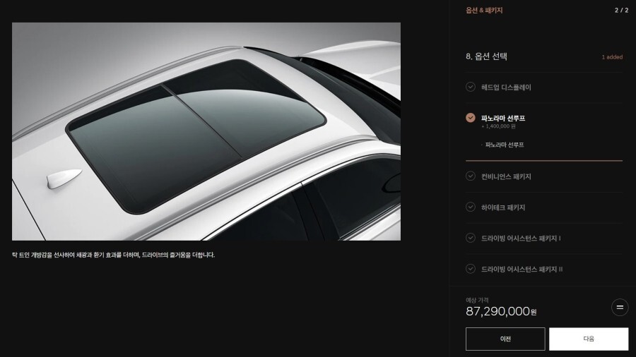 저는 제가 필요하다고 생각하는 파노라마 선루프와 렉시콘 사운드 패키지만 추가할게요!